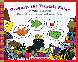 Gregory, the Terrible Eater: Gregory isn't like most goats. Instead of indulging in delicacies like old shoes, boxes, and bottle caps, he prefers to eat fruits, vegetables, eggs, and fish. Mother Goat and Father Goat are disgusted, and after several attempts to get Gregory to eat like a proper goat, they finally take him to see Dr. Ram. But when Gregory finally develops a taste for flat tires and broken violins, he's not just eating like a goat---he's eating like a pig! Will Gregory be able to find a healthy balance before he eats everything in the house?