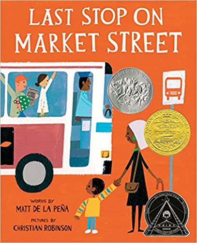 Last Stop on Market Street: Every Sunday after church, CJ and his grandma ride the bus across town. But today, CJ wonders why they don't own a car like his friend Colby. Why doesn't he have an iPod like the boys on the bus? How come they always have to get off in the dirty part of town? Each question is met with an encouraging answer from grandma, who helps him see the beauty--and fun--in their routine and the world around them. This energetic ride through a bustling city highlights the wonderful perspective only grandparent and grandchild can share, and comes to life through Matt de la Peña's vibrant text and Christian Robinson's radiant illustrations.