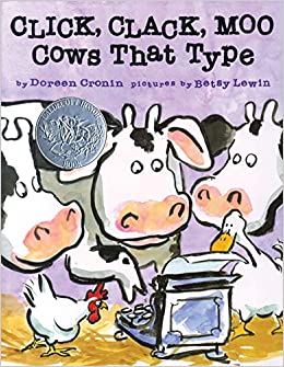 Click, Clack, Moo- Cows That Type: Farmer Brown has a problem. His cows like to type. All day long he hears Click, clack, MOO. Click, clack, MOO. Clickety, clack, MOO. But Farmer Brown's problems REALLY begin when his cows start leaving him notes....Doreen Cronin's understated text and Betsy Lewin's expressive illustrations make the most of this hilarious situation. Come join the fun as a bunch of literate cows turn Farmer Brown's farm upside down.