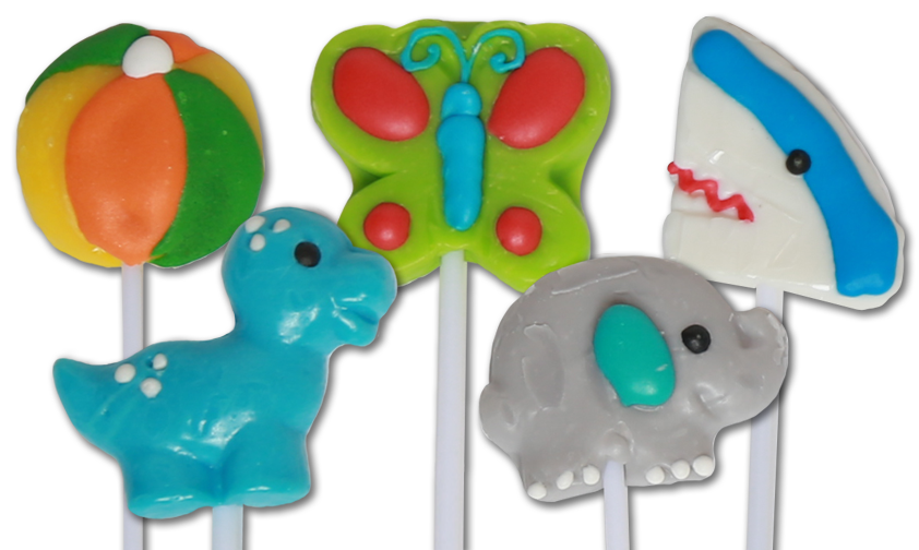 Little Lollipops: These little treats include a wide variety of cute animals and fun objects. Rainbows, unicorns, fish, elephants, tigers, trains, dinosaurs, and fire engines are just some examples. Each one is about 2 inches in diameter.